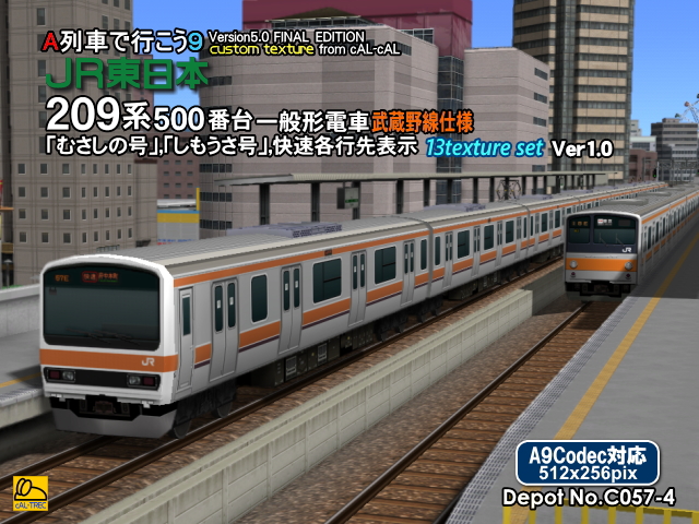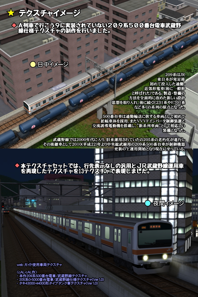 ■実車について 209系500番台は平成10(1998)年に量産が開始された区分で、吃緊の課題だった中央総武線103系置換えのため登場したものです。 (詳細は209系中央総武線テクスチャガイドを参照下さい)。 武蔵野線では205系電車による運用が行われていましたが2010(平成22)年に京葉線用から209系500番台車が転用(8両x3本)、山手線E235系投入による玉突き転配により中央総武線から2017(平成29)年以降転入し、 現在88両(8両x11本)がE231系0番台車(8両x34本)と共に運用されています。 ■A列車で行こう9での活用 本テクスチャは2017年以降、現行運用中の209系を表現しました。205系との新旧交代、E231系0番台車との共通運用といった様々なシーンや他線区へ直通する「むさしの号」「しもうさ号」も表現しましたので様々なシーンを演出することができるでしょう。 ■加工のポイント テクスチャーの差し替えという限られた中での加工ですので、妥協を余儀なくされた点があります。本テクスチャは実車とは違う点がありますので、ご了承下さい。以下できたこと、断念したことを列記します。