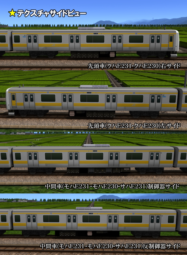 テクスチャーの差し替えという限られた中での加工ですので、妥協を余儀なくされた点があります。本テクスチャは実車とは違う点がありますので、ご了承下さい。以下製品版E231系500番台