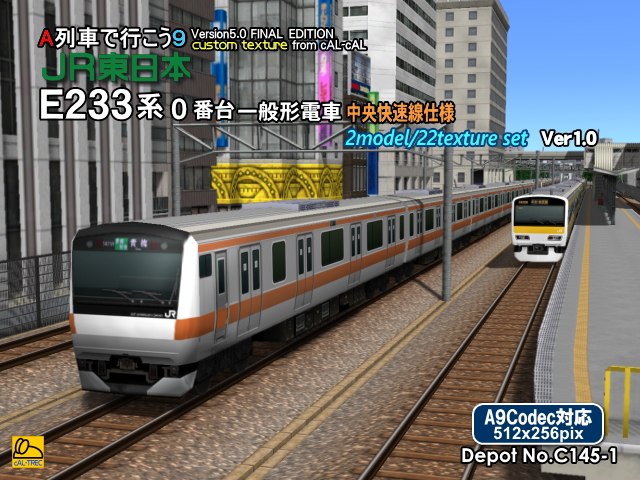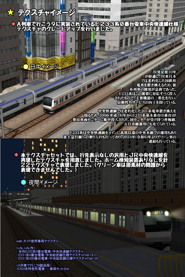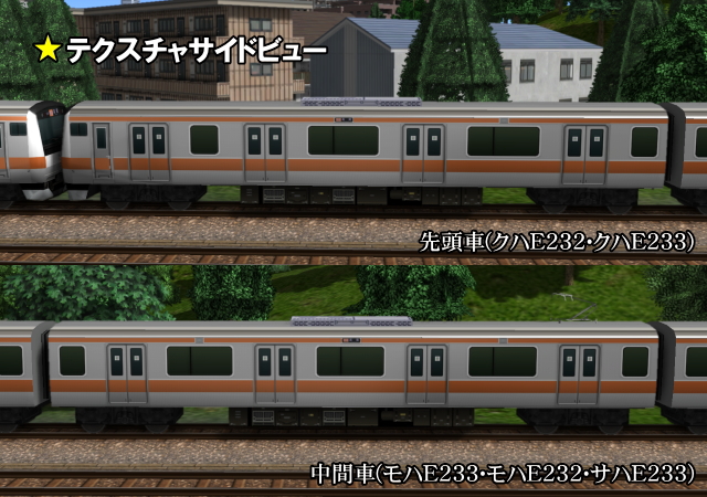■A列車で行こう9での活用 平成中期以降、現在進行形で運用されている電車であり、多くの車両とのコラボレーションが楽しめる車種です。残念ながらグリーン車登場前のテクスチャとなるため、最新の編成を再現することはできませんが、後発実装のテクスチャに引けを取らないグレードアップを図りました。 ■加工のポイント テクスチャーの差し替えという限られた中での加工ですので、妥協を余儀なくされた点があります。本テクスチャは実車とは違う点がありますので、ご了承下さい。以下製品版E233系(オレンジ)との相違点と、断念したことを列記します。