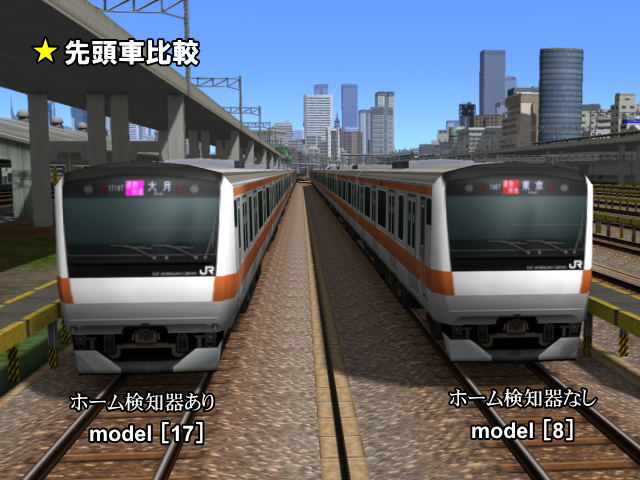■参考資料・サイト web:ウィキペディアフリー百科事典 JR東日本E233系電車 より web:ウィキペディアフリー百科事典 中央線快速 より web:RailFile.jp 様 https://railfile.jp/ JR東日本E233系 より・・・床下機器配置の参考にさせていただきました。 weg:行先表示Wiki 様 https://ikisakihyouji.wiki.fc2.com/ JR東日本 E233系0番台 中央快速線 青梅・五日市線 八高線 富士急行線 より・・・行き先表示器内容について参考にさせていただきました。 web:4号車の5号車寄り 様 https://4gousya.net/ より・・・編成構成について参考にさせていただきました。 blog:233NETWORK 様 http://201113.blog98.fc2.com/ 2010.3.9付 補助ワイパー止め 設置開始 より・・・運転台ワイパー回り表現の参考にさせていただきました。 blog:tc205-37のブログ 様 https://ameblo.jp/tc205-37/ 2025.9.1付 [平日]豊田セE233系T編成運用表 [25.3.15改正] 他 より・・・中央快速線運用について参考にさせていただきました。 blog:綾瀬人~Ayasejin~ 様 https://www.ameba.jp/profile/general/chiyodaline6000/ 2024.12.29付 ホーム検知装置のないE233(中央線) より・・・ホーム検知器表現の参考にさせていただきました。 各サイト運営のみなさまありがとうございました。 |
