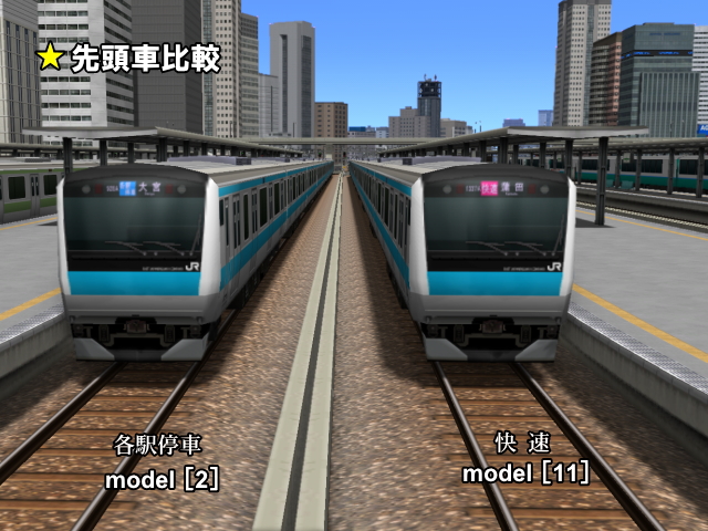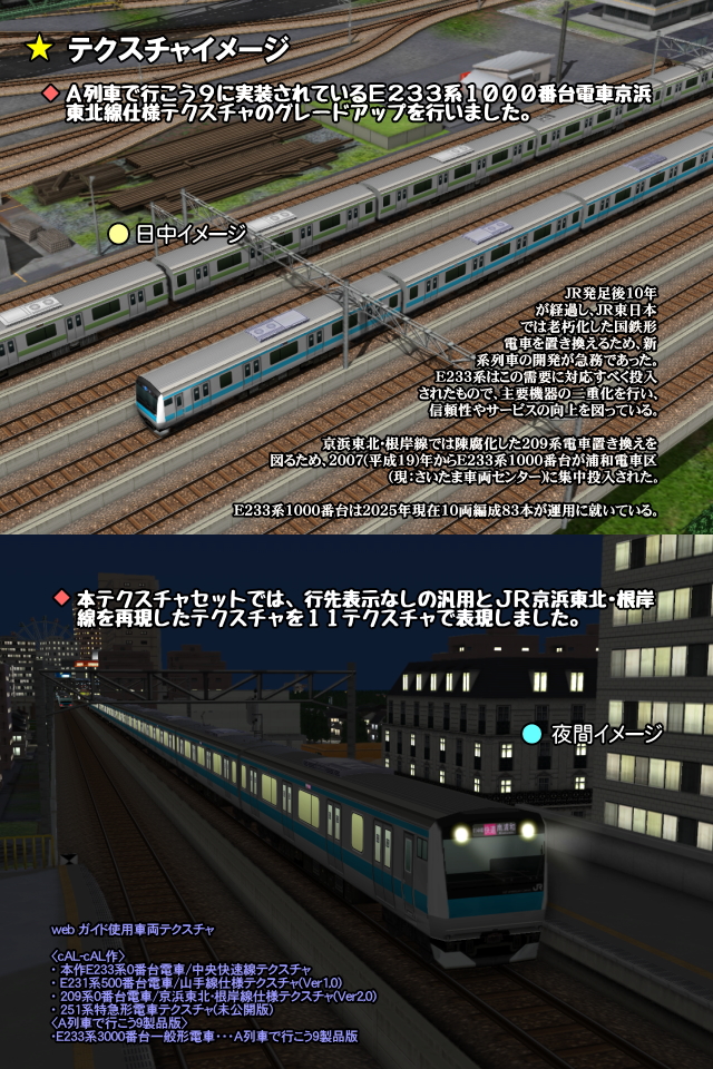■A列車で行こう9での活用 平成中期以降、現在進行形で運用されている電車であり、多くの車両とのコラボレーションが楽しめる車種です。車両キット等後発実装のテクスチャに引けを取らないグレードアップを図りました。 ■加工のポイント テクスチャーの差し替えという限られた中での加工ですので、妥協を余儀なくされた点があります。本テクスチャは実車とは違う点がありますので、ご了承下さい。以下製品版E233系(スカイブルー)との相違点と、断念したことを列記します。