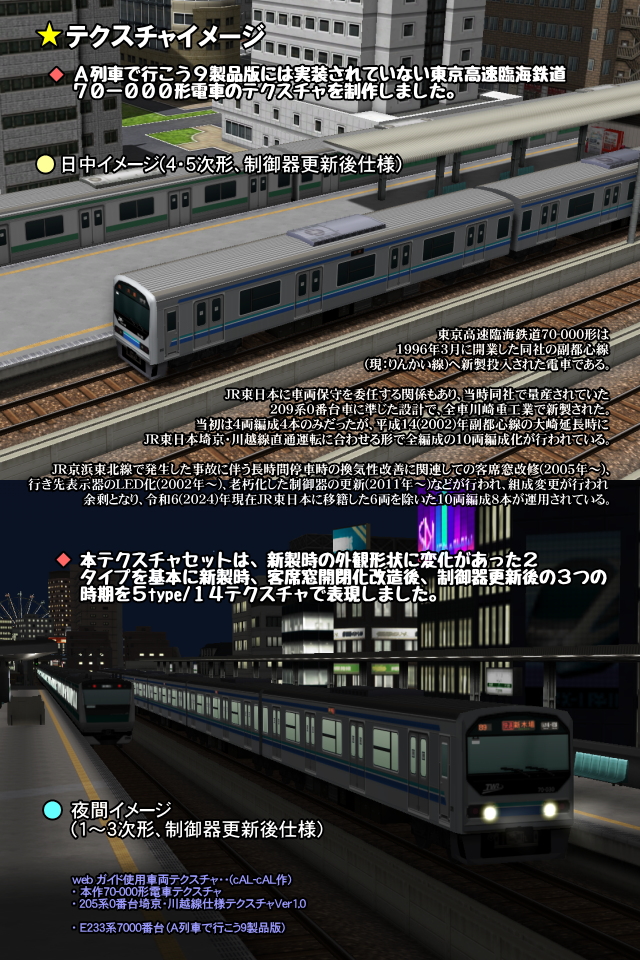 編成は当初4両でしたが、平成14(2002)年の埼京線直通運転開始に伴い10両編成化され、(自社線内運転用に6両編成が一時期存在したが後に解消している)その際、1次~3次車については組成を変更、4次・5次車を中間に増結しています。新形式導入のアナウンスが聞こえてきていますが、当面は活躍が続くことでしょう。 ※10両化後の編成については添付の編成表を参照下さい。 ■A列車で行こう9での活用 相互直通運転を行っているJR東日本の205系・E233系7000番台車、埼京線内で併走していた山手線のE231系500番台や現行のE235系、更には中央線・総武緩行線列車などとのコラボレーションなど多くの車両とのコラボレーションが楽しめる車です。209系テクスチャを持て余すことになる最新の鉄道風景には良い素材と言えるでしょう。 ■加工のポイント となった209系とは前面形状が若干異なるため完全な再現には至りませんが、本テクスチャの制作では特徴的な運転台形状など209系0番台車との違いを極力表現しました。しかしながら、テクスチャーの差し替えという限られた中での加工ですので、妥協を余儀なくされた点があります。従って本テクスチャは実車とは違う点がありますのでご了承下さい。以下できたこととできなかったことを列記します。