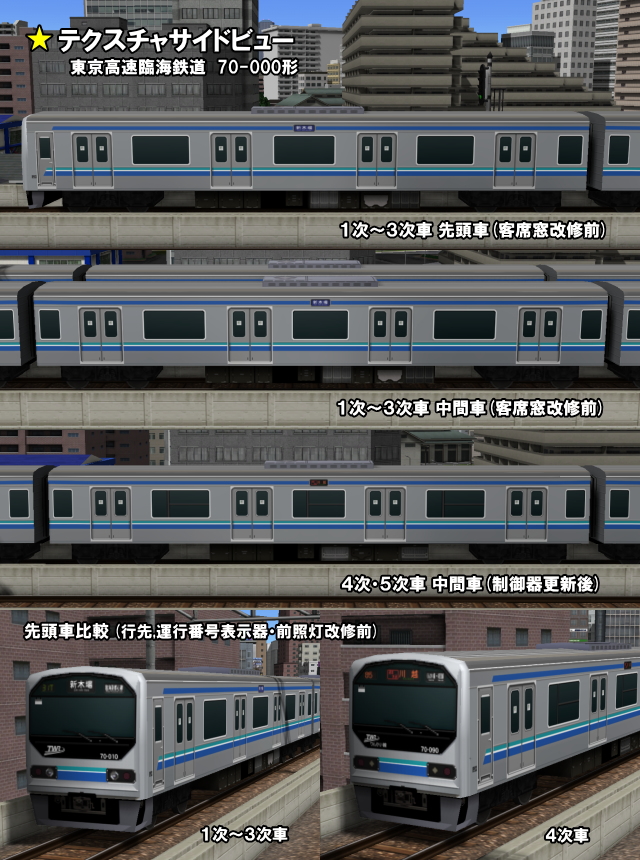 ■実車について 平成8(1996)年開業した東京高速臨海鉄道副都心線(2002年にりんかい線へ改称)用の電車として新製されたのが70-000形です。仕様はJR東日本の209系電車0番台車に準じた仕様となっていますが、これは車両保守を同社へ検修業務を委託していたため、新製・保守費用のコストカットを図ったためでした。ただ、209系とは前面形状や室内の意匠などの仕上げが異なっており、車体外板厚も厚いものを採用していました。(209系はt=1.2mm、70-000形はt=1.5mm)